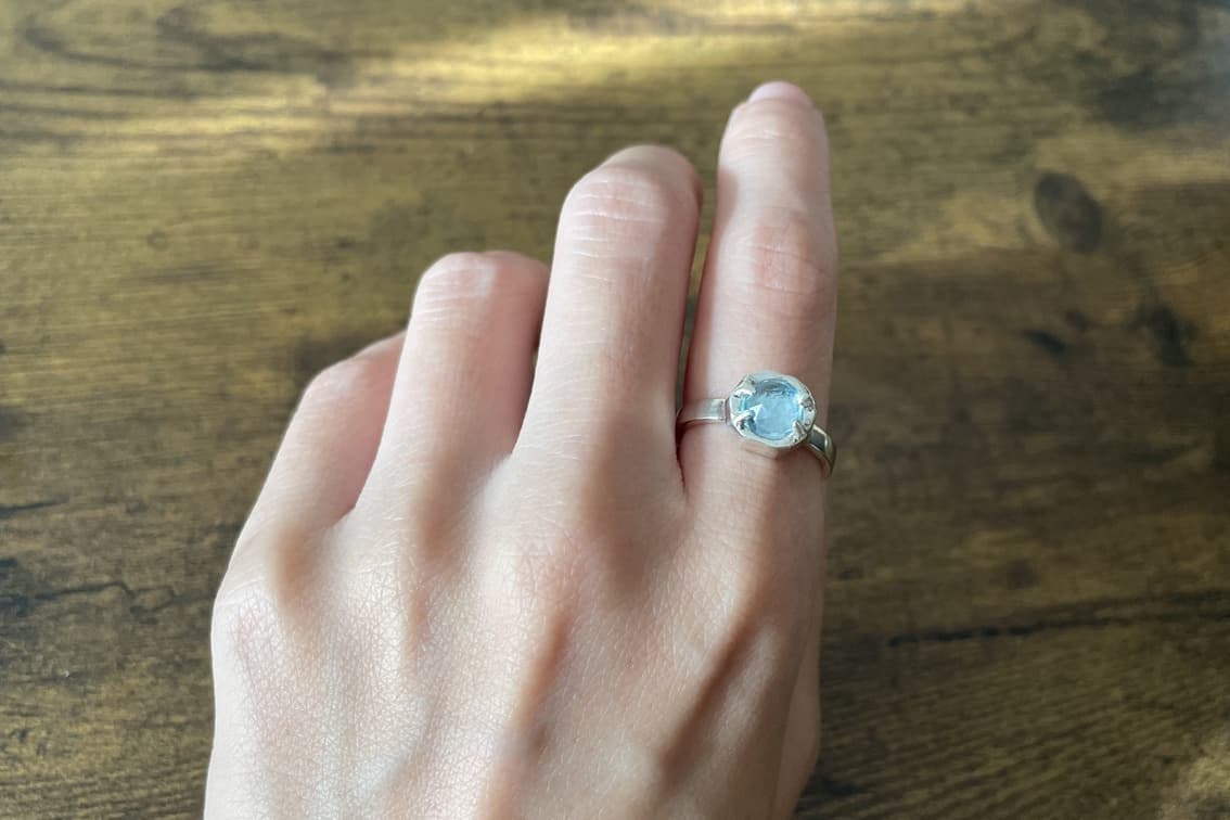 Dome ドーム ドーム型建築をイメージした印象的なリング。天然石と、シルバー自体の線と面の造形のバランスにこだわり、素材そのものの輝きを引き立てる。 ・リング幅:2.5mm リング厚み:1.5mm・サイズ:9.10.11.12.13.14.15号・素材:silver925・石:ブルートパーズ 6mm グレームーンストーン 6mm