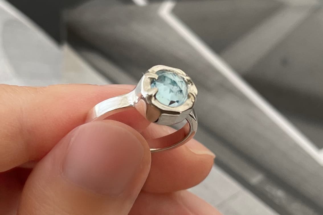 Dome ドーム ドーム型建築をイメージした印象的なリング。天然石と、シルバー自体の線と面の造形のバランスにこだわり、素材そのものの輝きを引き立てる。 ・リング幅:2.5mm リング厚み:1.5mm・サイズ:9.10.11.12.13.14.15号・素材:silver925・石:ブルートパーズ 6mm グレームーンストーン 6mm